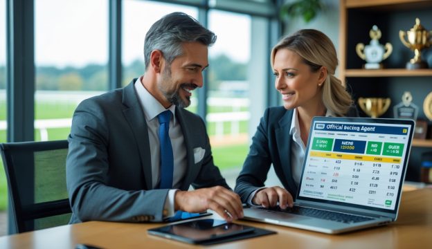 Seorang pria dan wanita di kantor modern sedang berdiskusi di depan laptop dengan latar belakang trek balap kuda dan piala.