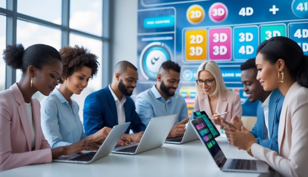 Beberapa orang dewasa menggunakan perangkat digital untuk bermain lotere online dengan tampilan angka warna-warni dan suasana modern.
